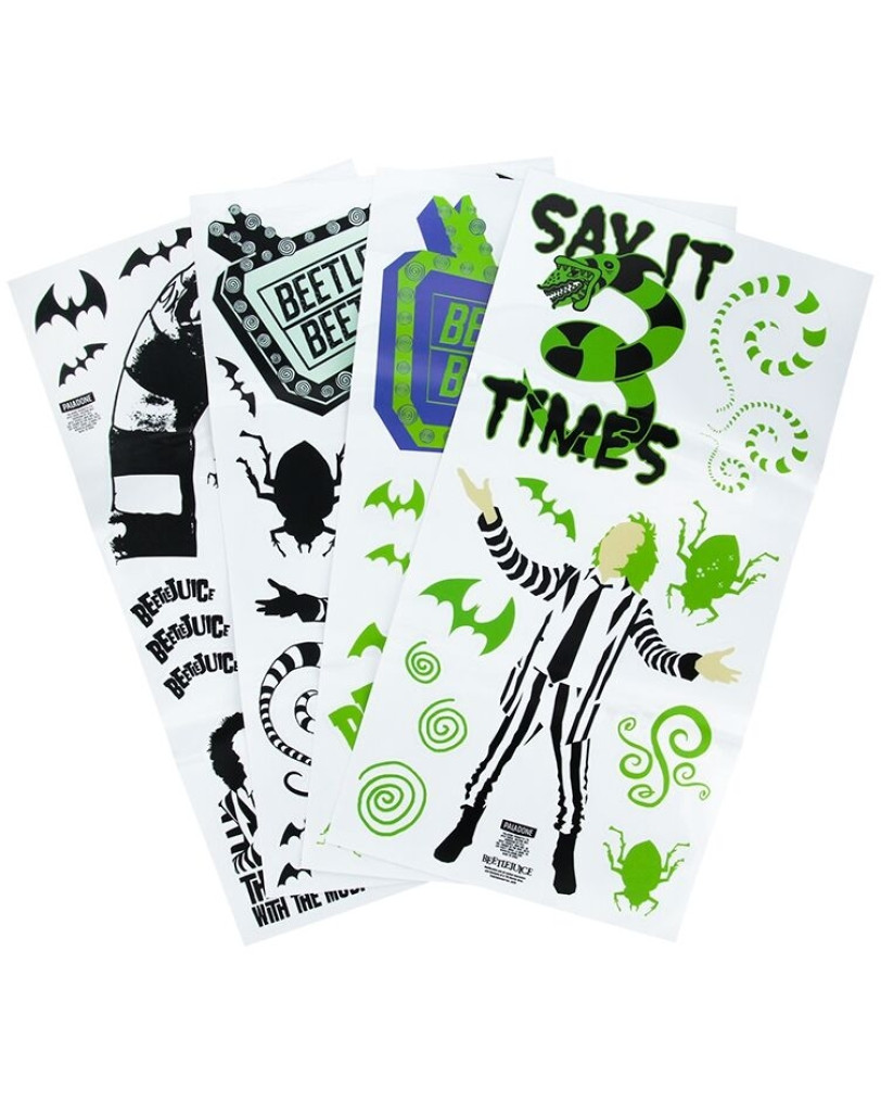 Pred mano je paket stenskih nalepk Beetlejuice proizvajalca Paladone, ki so mi ga prijazno posodili fantje iz Konzolka. Gre za uradno licenciran izdelek, namenjen vsem ljubiteljem Tima Burtona in njegovega kaotičnega bio-izganjalca. V paketu dobimo štiri pole, polne različnih nalepk z motivi iz filma. Tu so Beetlejuice v več pozah, Lydia Deetz, črvi iz peščenega planeta, priročnik za nedavno preminule in seveda znameniti napis Never Trust The Living. Prvi vtis je odličen. Tisk je kakovosten, barve so žive in zveste filmski predlogi. Največje presenečenje pa je, da se nekatere nalepke svetijo v temi, kar doda piko na i celotnemu vzdušju.