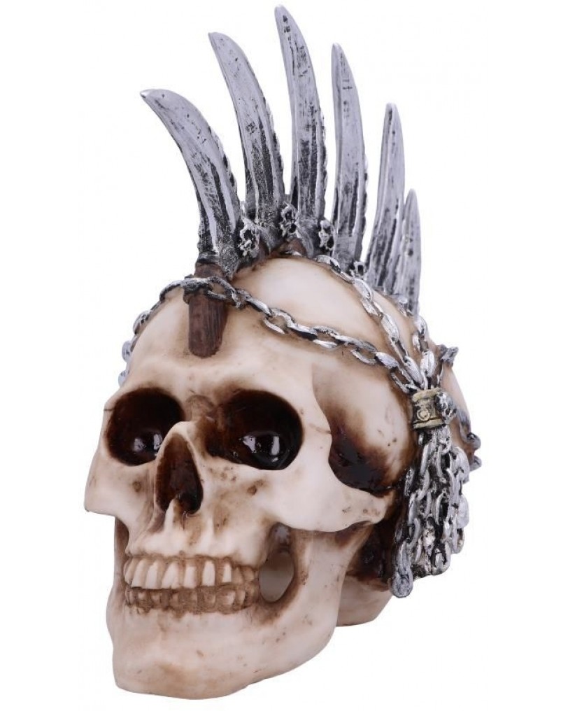 Pred nami je zbirateljska figurica z imenom Chain Blade. Gre za okrasno lobanjo v naravni velikosti, ki pa ni zgolj navadna lobanja. Njen osrednji del krasi drzna irokeza, sestavljena iz okrašenih rezil, ki so med seboj povezana z verigami. Detajli, kot so manjše kovinske lobanje na rezilih, dodajo piko na i celotnemu videzu. Izdelek je namenjen ljubiteljem fantazijske, srednjeveške in gotske estetike. Že na prvi pogled je jasno, da je figurica izdelana iz visokokakovostne smole (polyresin) in je ročno poslikana, kar ji daje unikaten pridih. V roki deluje presenetljivo masivno in težko, kar potrjuje kakovost izdelave.