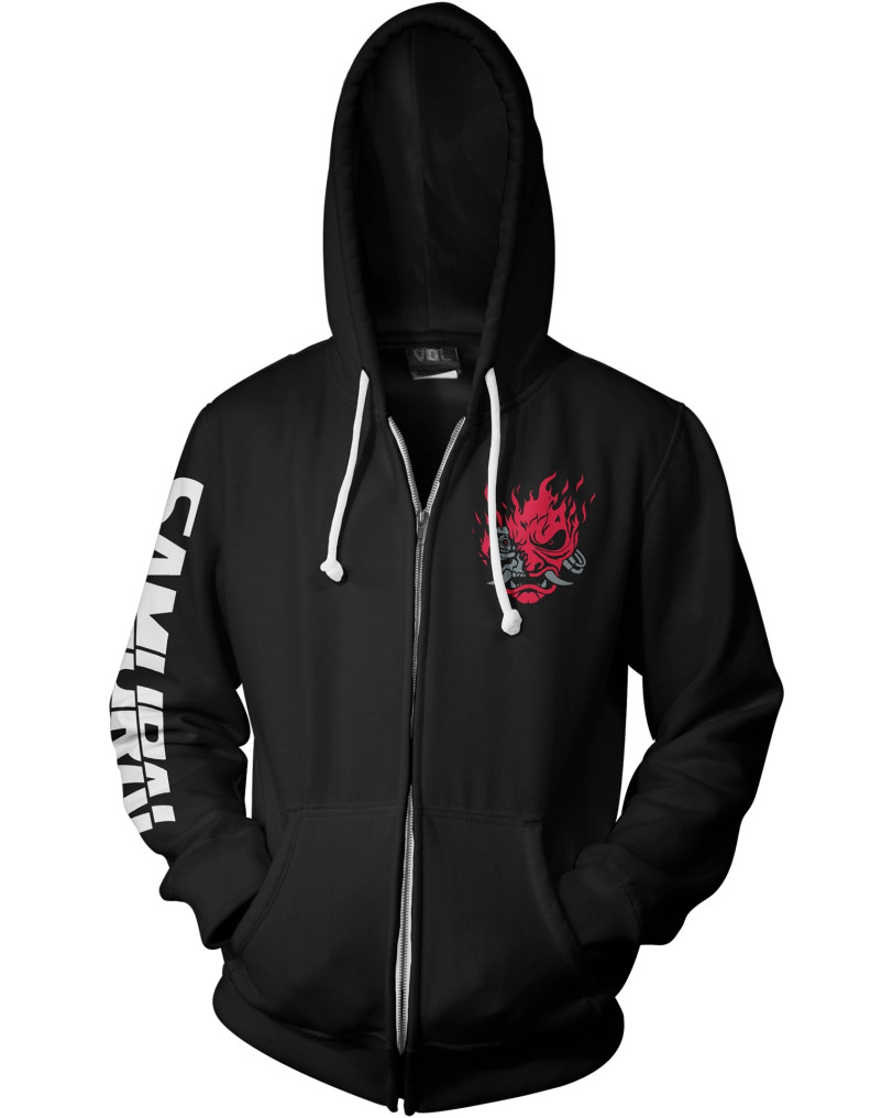 Gre za klasično črno jopico s kapuco in zadrgo, ki pa jo od povprečja ločijo premišljeno oblikovani detajli. Na sprednji strani je majhen, a prepoznaven logotip skupine Samurai, medtem ko hrbtna stran nosi veliko, stilizirano podobo demonske maske, ki jo poznamo iz igre. Na rokavu je še dodaten napis, ki zaokroži celoto. Jopica je uradno licenciran izdelek, kar pomeni,- da je narejena v sodelovanju z CD Projekt Red. Že ob prvem otipu se čuti, da ne gre za poceni material; mešanica bombaža in poliestra deluje trpežno in prijetno.