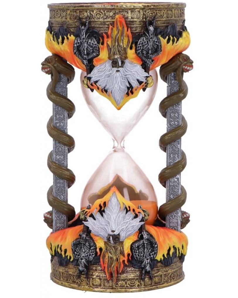 Gre za uradno licencirano peščeno uro, ki jo je izdelalo priznano podjetje Nemesis Now, navdih pa črpa iz enega najbolj ikoničnih likov serije Dark Souls – Gwyna, Gospoda pepela. Že na prvi pogled je jasno, da ne gre za navaden merilec časa, temveč za umetniški izdelek. Visoka je 17,5 centimetra in izdelana iz visokokakovostne smole (polyresin), ki je ročno poslikana, kar ji daje pristen, staran videz. Detajli so osupljivi: stebra, ki držita stekleni del, sta oblikovana kot prepleteni kači, robove pa krasijo motivi ognja, kar takoj prikliče v spomin nepozaben boj z Gwynom.