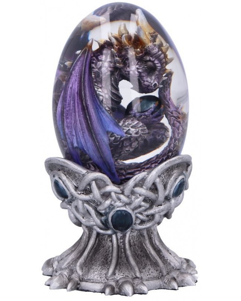 Pred mano je figurica Elemental Dragonlings Air priznanega proizvajalca Nemesis Now. Gre za zbirateljski izdelek, ki ni namenjen igranju, temveč postavitvi na polico ali mizo. Figurica upodablja majhnega srebrnega zmaja z vijoličastimi krili, ki sedi znotraj prozornega jajca. Vse skupaj stoji na lepo okrašenem srebrnem podstavku. Že embalaža, trdna in zaščitena darilna škatla, daje vedeti, da ne gre za navadno igračo. Ko sem figurico prvič prijel v roke, me je presenetila teža. Izdelana je iz poliresina, umetne smole, ki je na otip precej masivna in daje občutek kakovosti.