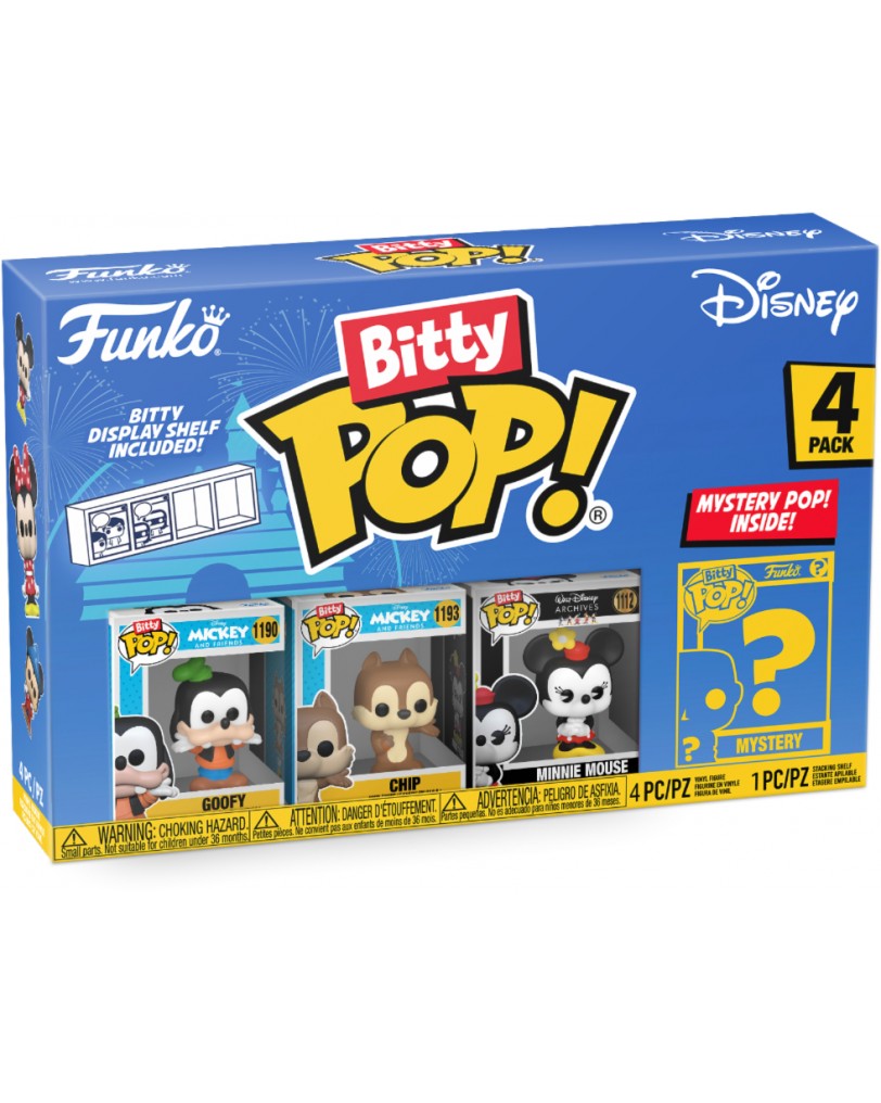Gre za paket štirih miniaturnih figuric iz vinila, ki so pomanjšane različice klasičnih Funko Pop! figur. V prozorni embalaži takoj vidimo tri junake: Goofyja, Chipa (iz dvojca Chip in Dale) ter Minnie Mouse. Četrta figurica pa ostaja skrivnost, kar doda element presenečenja in vznemirljivega odpiranja. Prvi vtis je odličen. Vsaka figurica je visoka le okoli 2,3 centimetra in je zapakirana v svojo majhno akrilno škatlico, ki posnema videz originalne Funko embalaže. Celoten komplet pride v večjem, trdem akrilnem ohišju, ki služi kot priročno stojalo za razstavljanje.