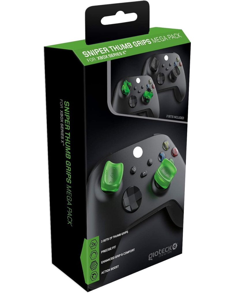 Gioteck Sniper Mega Pack je komplet treh parov silikonskih nastavkov za analogne palčke, zasnovan za Xbox One in Xbox Series X/S igralne ploščke. Namenjeni so izboljšanju oprijema, udobja in natančnosti med igranjem. V lični embalaži najdemo tri različne pare nastavkov: dva para sta konkavne (vdolbene) oblike z različno teksturo za boljši oprijem, tretji par pa je konveksen (izbočen) in višji, namenjen predvsem desni analogni palički za natančnejše merjenje v strelskih igrah. Prvi vtis je bil odličen. Silikon deluje kakovostno in trpežno, ne gre za poceni plastiko, ki bi se hitro obrabila. Barvna kombinacija črne in živo zelene se lepo poda k Xbox estetiki.