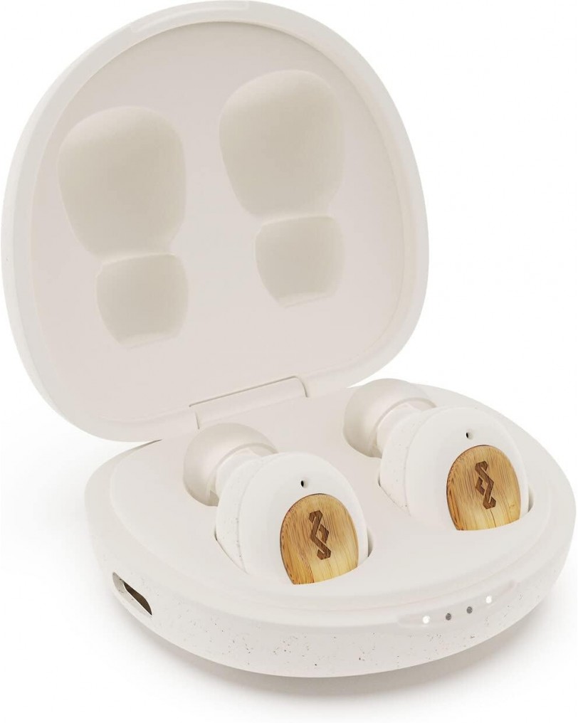 Slušalke House of Marley Champion so majhne, ušesne brezžične slušalke, ki delujejo preko povezave Bluetooth. Združljive so s praktično vsemi napravami, ki podpirajo to tehnologijo: pametnimi telefoni (iOS in Android), tablicami, osebnimi računalniki in prenosniki. Že sama embalaža, narejena iz recikliranih materialov, sporoča filozofijo podjetja. V notranjosti najdemo majhno polnilno škatlico, slušalki, kratek USB-C polnilni kabel in dodatne silikonske nastavke. Prvi vtis je odličen. Škatlica in slušalki so narejene iz kombinacije bambusa in kompozita iz naravnih lesnih vlaken ter recikliranega silikona. So izjemno lahke in prijetne na otip, krem barva pa jim doda eleganten, nevpadljiv videz.
