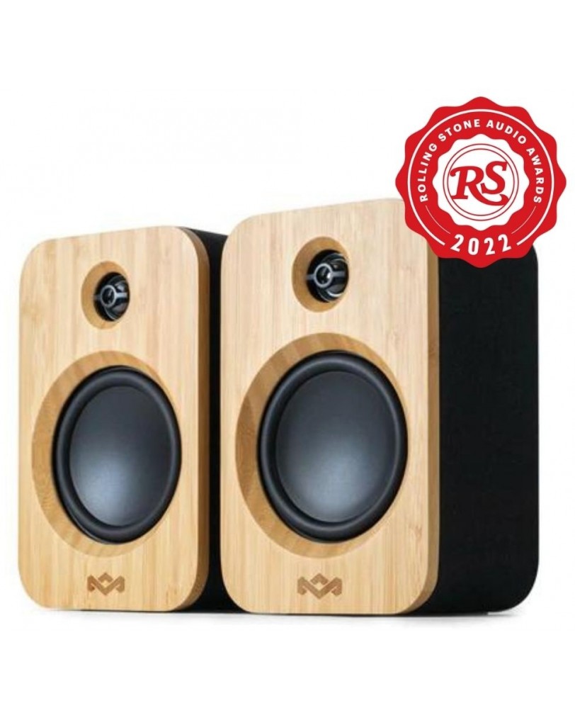 House of Marley Get Together Duo je komplet dveh brezžičnih stereo zvočnikov, ki delujeta malce drugače. Gre za hibridni sistem: levi zvočnik je stalno priključen na električno omrežje, desni pa ima vgrajeno baterijo, ki zdrži do 20 ur predvajanja. Ta zasnova omogoča, da imate doma postavljen stereo sistem, po potrebi pa desni zvočnik preprosto vzamete s seboj na vrt ali v drug prostor. Že ob odpiranju embalaže, ki je seveda iz recikliranih materialov, navduši kakovost izdelave. Sprednja plošča iz pravega bambusa in ohišje, prevlečeno s tkanino Rewind, narejeno iz mešanice recikliranega bombaža, konoplje in plastenk, dajeta občutek topline in trajnosti. Združljiva sta praktično z vsem: preko povezave Bluetooth 5.0 se povežeta z mobilnimi telefoni (iOS in Android) in računalniki, imata pa tudi RCA in 3.5 mm AUX vhoda za priklop gramofonov, televizorjev ali igralnih konzol, kot so PlayStation 5, Xbox Series X/S in celo Nintendo Switch 2.