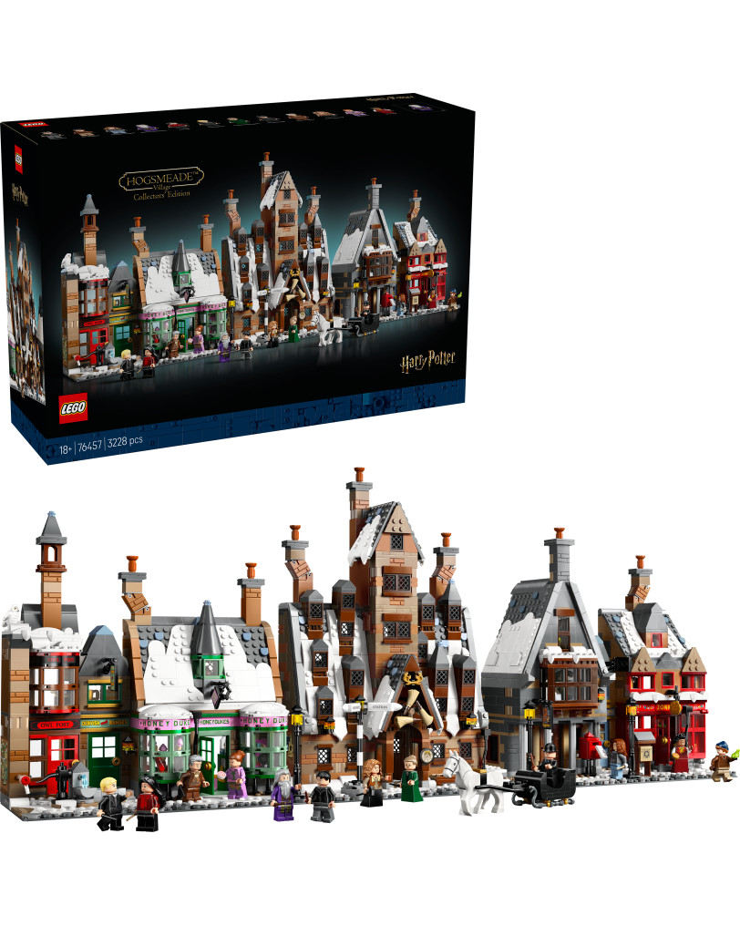 Pred nami je zbirateljska izdaja LEGO Harry Potter Hogsmeade Village. To ni igrača za otroke, ampak obsežen projekt za odrasle oboževalce, kar pove že oznaka 18+. V masivni škatli se skriva 3228 kock, ki sestavijo sedem ikoničnih poslopij iz čarovniške vasice, vključno s trgovino s sladkarijami Honeydukes, pošto, gostilno The Three Broomsticks in, prvič v LEGO obliki, trgovino s šalami Zonkos Joke Shop ter pubom Hogs Head. Priloženih je tudi dvanajst figuric, med njimi Harry, Ron, Hermiona in Aberforth Dumbledore. Že ob odpiranju škatle je jasno, da gre za vrhunski izdelek, saj so navodila zapakirana v treh debelih knjigah, kocke pa so logično razdeljene v oštevilčene vrečke.