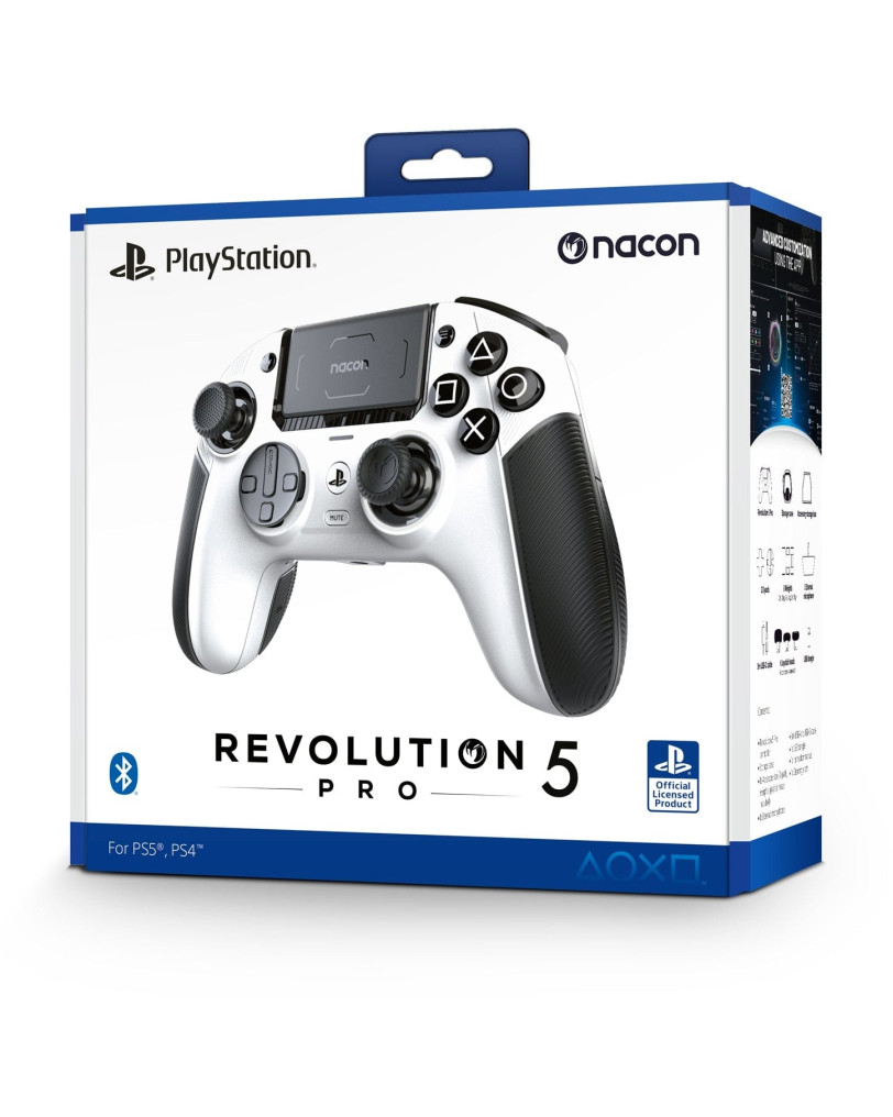 Nacon Revolution 5 Pro je brezžični profesionalni igralni plošček, namenjen uporabi na konzolah PlayStation 5, PlayStation 4 in na osebnih računalnikih. Že ob odprtju škatle postane jasno, da ne gre za navaden kos plastike. Vse je spravljeno v trpežni torbici, kjer poleg ploščka najdemo še cel kup dodatkov: različne uteži, zamenljive glave in osnove za analogne palice ter celo krpico za čiščenje. Prvi vtis, ki mi ga je omogočila ekipa iz Konzolka, je bil izjemen. Plošček deluje robustno, materiali so prijetni na otip, asimetrična postavitev palic pa bo takoj domača vsem, ki prisegajo na Xboxov dizajn.