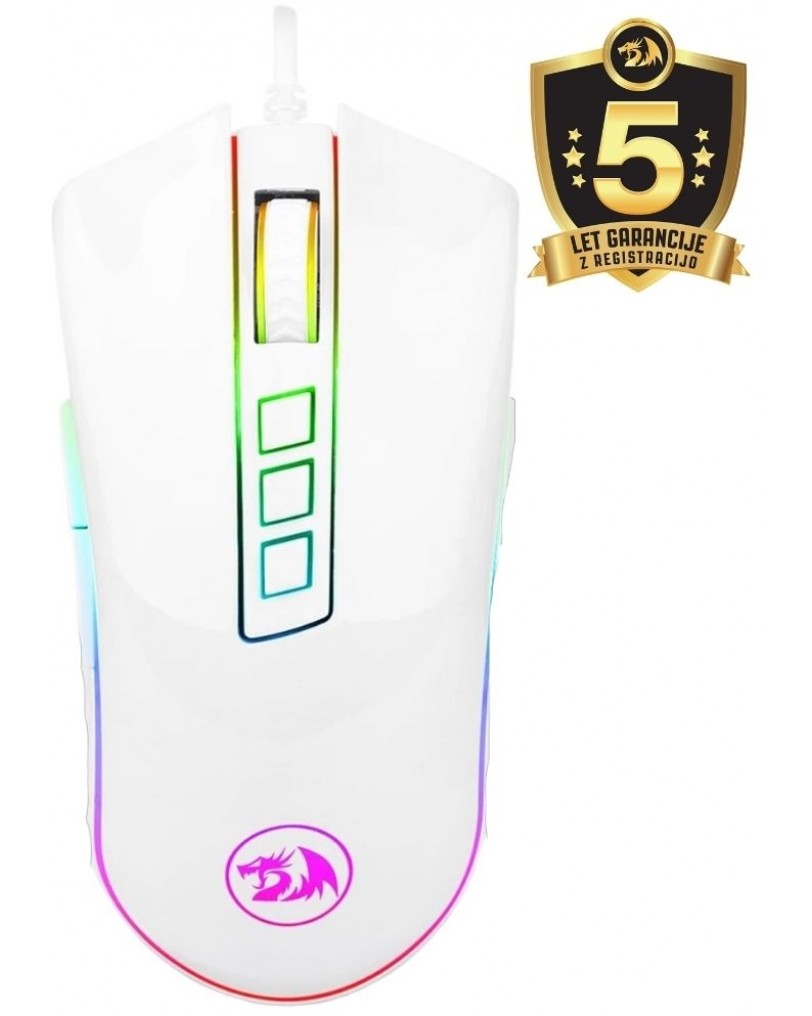 Kabel je dolg 1,8 metra in je pleten, kar preprečuje zapletanje in povečuje vzdržljivost. RGB osvetlitev je presenetljivo svetla in enakomerna, z več različnimi načini, ki jih lahko preklapljate kar na miški ali podrobneje nastavite v programu. Posebej moram pohvaliti možnost shranjevanja do petih različnih profilov neposredno na miško. To pomeni, da lahko svoje nastavitve vzamete s seboj in jih uporabljate na drugem računalniku brez nameščanja programske opreme. Redragon ponuja tudi možnost podaljšane 5-letne garancije ob registraciji izdelka, kar je v tem cenovnem razredu prava redkost.