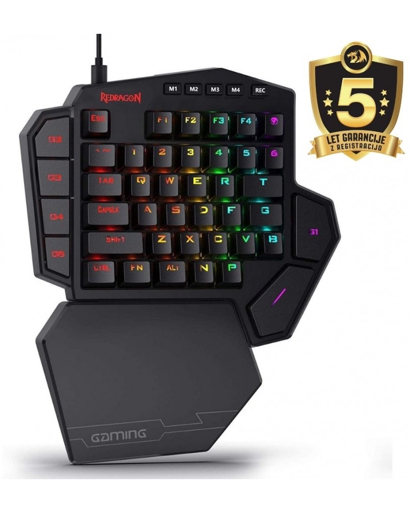 Redragon Diti K585 je natanko to: polovica tipkovnice, a z vsem, kar potrebujete za resno igranje. Gre za žično mehansko tipkovnico s 42 tipkami, ki je namenjena predvsem igričarjem na osebnih računalnikih (Windows, Mac OS X). Čeprav je primarno PC naprava, jo je mogoče s posebnim adapterjem, kot je Redragon GA200, uporabljati tudi na konzolah PlayStation 4, PlayStation 5, Xbox One, Xbox Series X/S in Nintendo Switch. Ko sem jo vzel iz škatle, me je presenetila teža. Kljub plastičnemu ohišju deluje robustno in trdno. V paketu dobite še snemljiv USB-C kabel, magnetno naslonjalo za zapestje ter celo nekaj rezervnih stikal in orodje za njihovo menjavo.