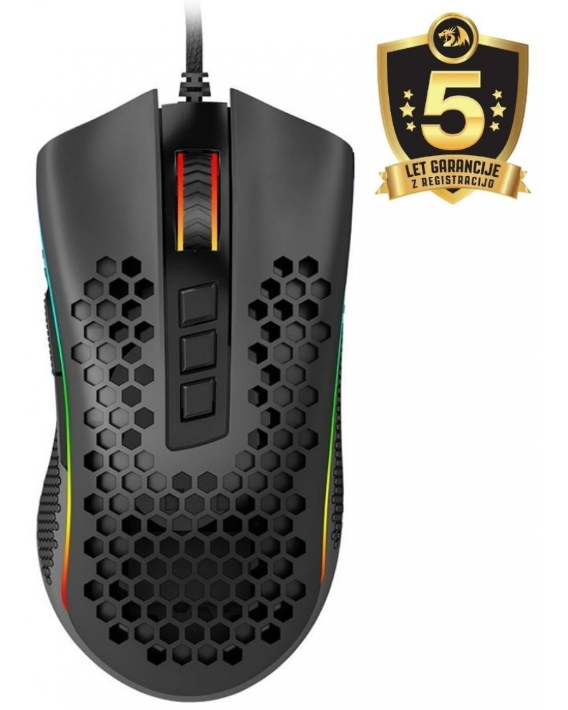 Redragon Storm M808 je žična igričarska miška, zasnovana z mislijo na hitrost in nizko težo. Njena najbolj očitna značilnost je ohišje v obliki satovja, ki zmanjša težo na vsega 85 gramov. Že ob prvem prijemu se čuti, da je miška narejena za hitre premike. V paketu poleg miške ne dobimo veliko, a je vse skupaj lično zapakirano. Namenjena je predvsem uporabnikom osebnih računalnikov z operacijskimi sistemi Windows, od XP do Windows 10. Čeprav je primarno PC periferija, sem jo iz radovednosti priklopil tudi na PlayStation 5 in delovala je brezhibno za navigacijo po menijih, kar je priročno.