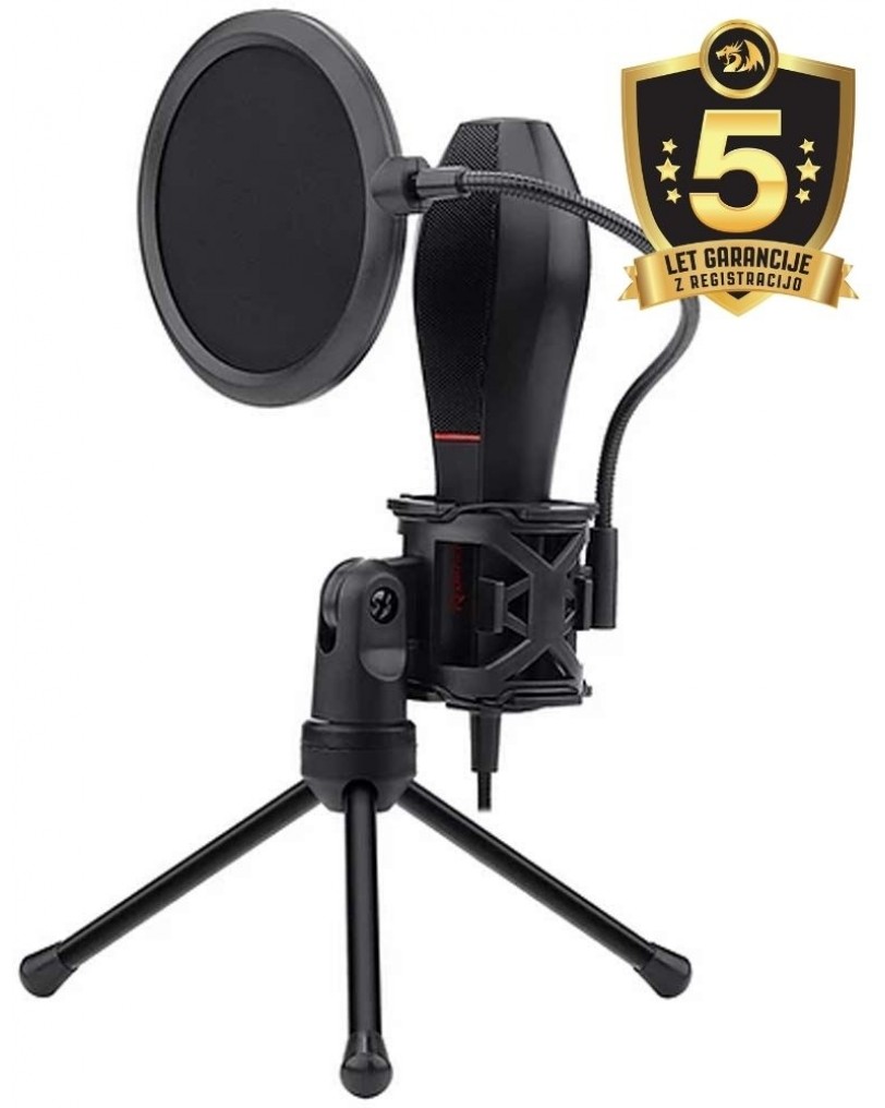 Mikrofon stoji na majhnem, a presenetljivo stabilnem trinožnem stojalu. Njegova višina ni nastavljiva, lahko pa spreminjamo naklon mikrofona, kar pomaga pri iskanju optimalnega položaja. Kabel je dovolj dolg za večino namiznih postavitev. Najbolj izstopajoča lastnost pa je zagotovo Redragonova podaljšana garancija. Ob registraciji izdelka na spletu v 30 dneh od nakupa pridobite kar 5-letno garancijo, imenovano zmajska vzdržljivost. To je v tem cenovnem razredu praktično nezaslišano in vliva veliko zaupanja v kakovost izdelka.