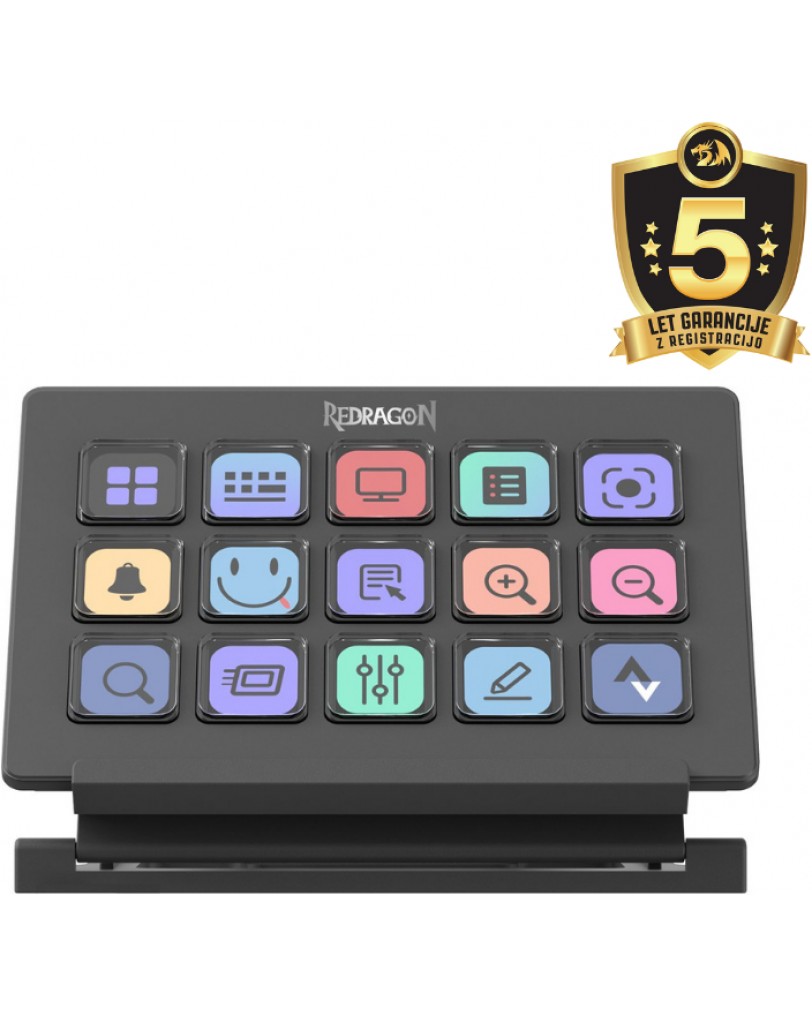 Naprava je s svojimi merami 134 x 92 x 15 mm zelo kompaktna in ne zavzame veliko prostora na mizi. Petnajst LCD gumbov je dovolj velikih za udobno uporabo, ločljivost 126x126 slikovnih pik pa zagotavlja jasno vidnost ikon. Ena izmed ključnih prednosti je možnost ustvarjanja do šestih različnih profilov, med katerimi lahko preklapljamo z enim samim gumbom. To pomeni, da imamo lahko ločene postavitve za igranje, urejanje videa, brskanje po spletu in tako naprej. Redragon ponuja tudi podaljšano petletno garancijo ob registraciji izdelka, kar priča o zaupanju v kakovost izdelave.