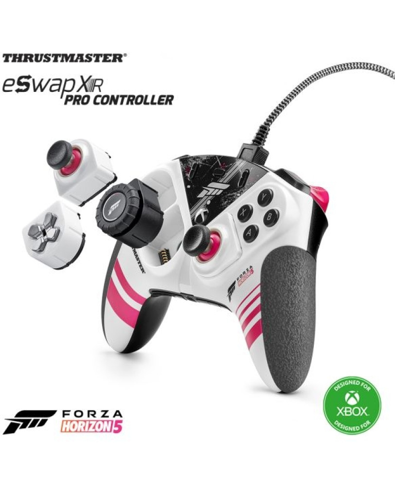 Thrustmaster Eswap XR Pro v Forza Horizon 5 ediciji je modularni žični igralni plošček, zasnovan primarno za Xbox Series X/S, Xbox One in osebne računalnike z operacijskim sistemom Windows. Že ob odpiranju škatle te pozdravi privlačen dizajn v barvah igre, ki takoj pade v oči. V paketu poleg samega ploščka najdemo pleten USB-C kabel, dve zamenljivi analogni paličici, D-pad in seveda zvezdo večera – Racing Wheel Module. Priložena je tudi enomesečna naročnina na Xbox Game Pass Ultimate, kar je lepa gesta. Občutek v rokah je robusten in kakovosten, čeprav bi si na ročajih želel malo več oprijema.