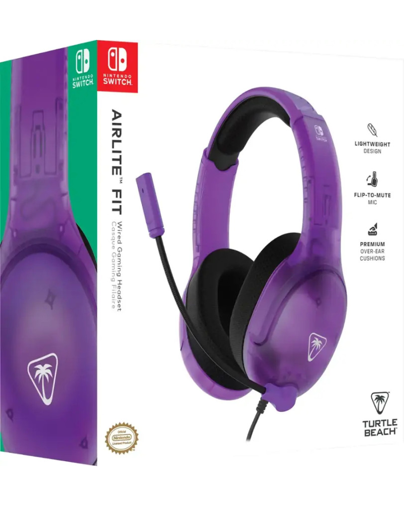 Slušalke Turtle Beach Airlite Fit so žične naglavne slušalke, namenjene predvsem igralcem. Že na embalaži je jasno, da so uradno licencirane za Nintendo Switch, a njihova uporabnost se tu ne konča. Z univerzalnim 3,5 mm priključkom so združljive praktično z vsem: s konzolami PlayStation 4, PlayStation 5, Xbox One in Xbox Series X/S (preko priključka na kontrolerju), z osebnim računalnikom in seveda z novo konzolo Nintendo Switch 2. Prvi vtis je presenetljivo dober za ta cenovni razred. Plastika je matirana in deluje kakovostno, vijolična barva pa je živahna in se lepo poda k igrivi naravi Switcha. Slušalke so izjemno lahke, kar obljublja udobje pri daljšem igranju.