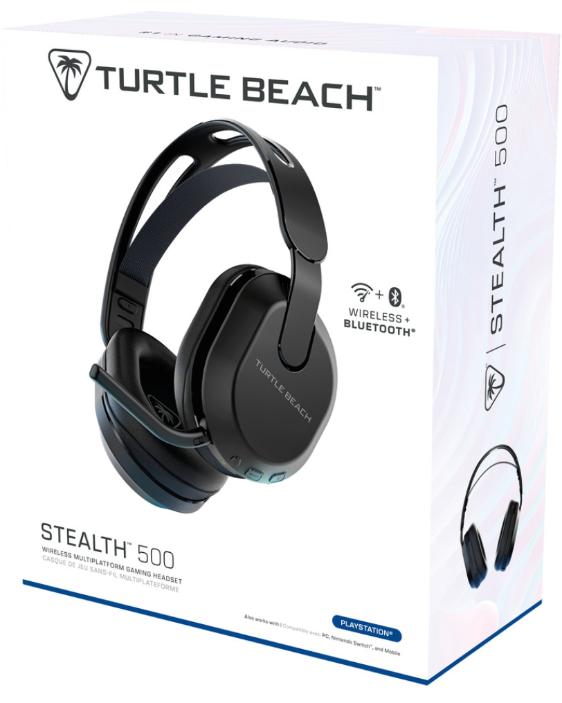 Turtle Beach Stealth 500 so brezžične igričarske slušalke, namenjene širokemu krogu uporabnikov. Že na škatli je jasno navedeno, da so združljive s praktično vsem: osebnim računalnikom, konzolami PlayStation 5 in 4, Nintendo Switch ter mobilnimi napravami. Ko sem jih vzel iz embalaže, me je presenetila njihova lahkotnost. S približno 230 grami so ene lažjih slušalk, kar sem jih kdaj preizkusil. Prvi vtis je bil pozitiven; plastika je sicer pričakovana v tem cenovnem razredu, a deluje dovolj trpežno, lebdeči naglavni trak in ušesne blazinice iz spominske pene pa obljubljajo udobje. V paketu je priložen USB oddajnik za 2.4GHz povezavo in polnilni kabel USB-C.