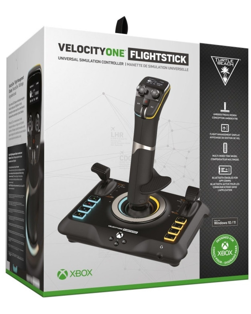 Turtle Beach VelocityOne Flightstick je univerzalna simulacijska palica, zasnovana za delovanje z osebnimi računalniki (Windows) ter konzolami Xbox One in Xbox Series X/S. Že ob odpiranju škatle je jasno, da ne gre za poceni igračo. Materiali delujejo kakovostno, palica pa ima prijetno težo, ki daje občutek trdnosti. V paketu poleg same palice najdemo še dolg, tri metre pleten USB-C v USB-A kabel in zamenljive glave za ročici za plin, kar je prijetno presenečenje. Prvi vtis je odličen – gre za premišljeno zasnovan kos opreme, ki deluje moderno in robustno, ne pa kot plastičen pripomoček.