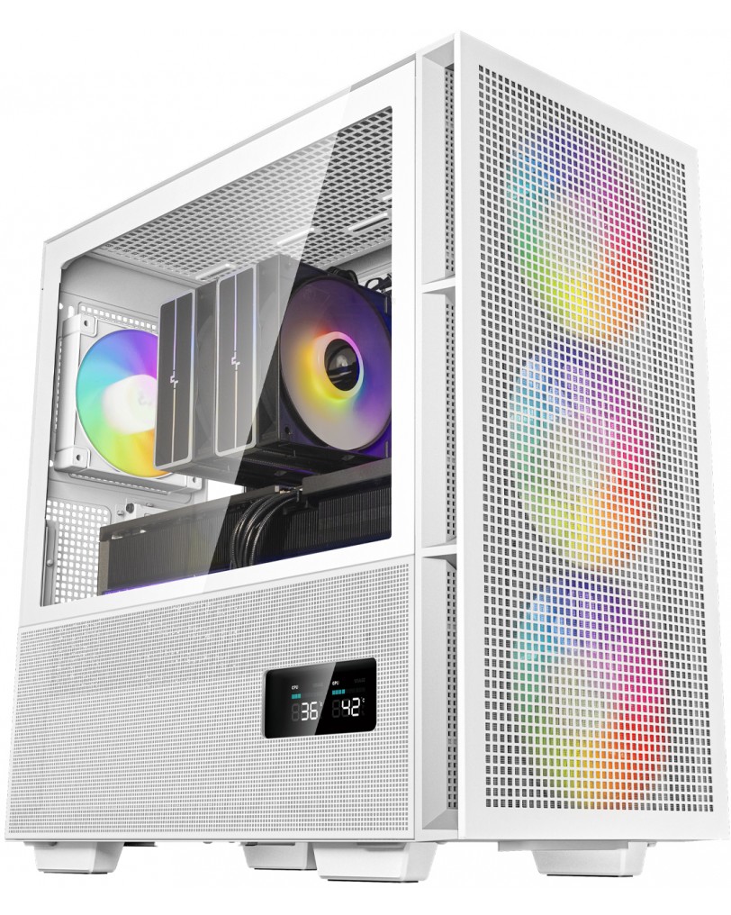 Sprednja nadzorna plošča omogoča hiter dostop do USB, Type-C in avdio vklopov, kar poenostavlja povezovanje perifernih naprav. Preko digitalne LED nadzorne plošče lahko spremljate temperaturo in obremenitev procesorja ter grafične kartice, kar vam omogoča enostaven nadzor delovanja sistema v realnem času.